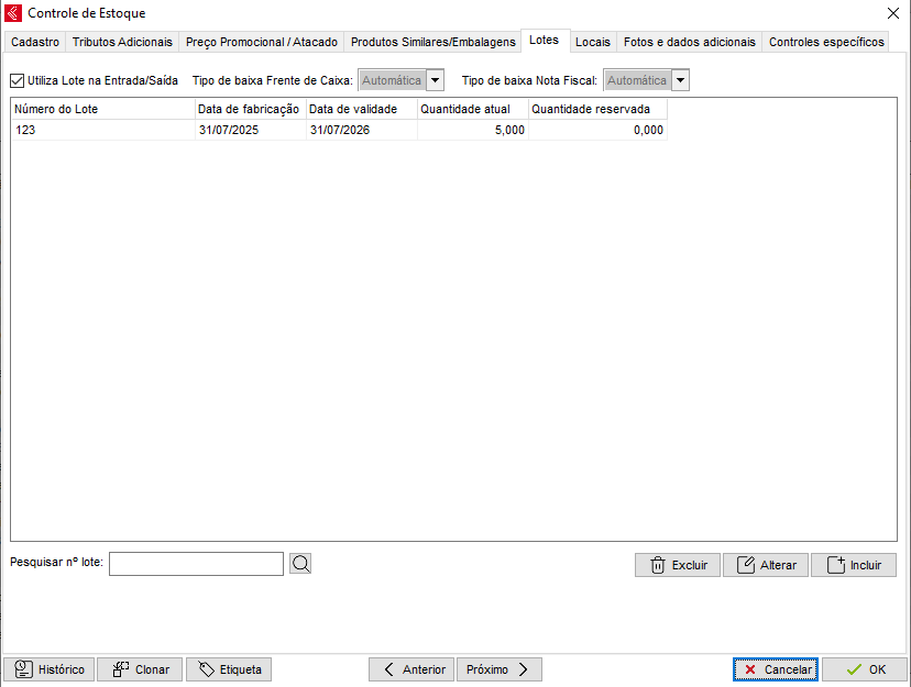 Na aba Lotes é possível controlar produtos por sua data de fabricação e data de validade. Ao efetuar a venda do produto o lote pode ser escolhido automaticamente (fazendo assim a venda do lote que tem a data de validade mais próxima da atual) ou também de forma manual, onde é possível que o vendedor escolha qual o lote que está sendo vendido. Para maiores dúvidas sobre o lote, clique aqui.