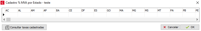 • Será aberta a tela para preenchimento, configure a alíquota de MVA de cada estado conforme instrução contábil