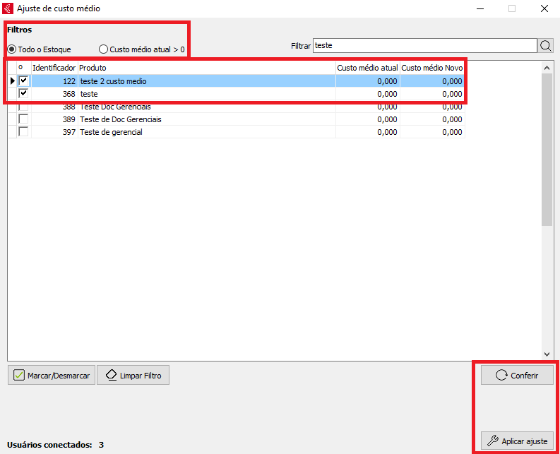 Após digitar a senha do supervisor, será possível aplicar o cálculo referente a todo estoque, ou, somente itens que possuírem custo médio MAIOR que zero, ao clicar em conferir, será listado na coluna Custo médio novo, caso concorde com os valores apresentados, clique em Aplicar Ajuste!