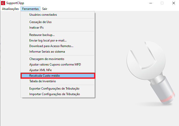 É possível ainda realizar a alteração pelo SupportClipp, através do menu Ferramentas - ​Recalcula Custo Médio;