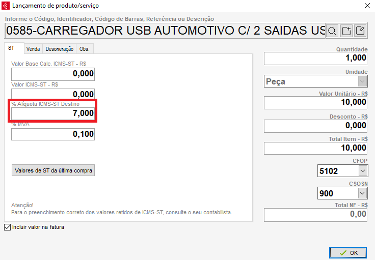 • %Alíquota interna: Por padrão o Clipp adiciona a alíquota da ST do estado do destinatário automaticamente, mas você pode alterar aqui, para você se localizar: A informação adicionada no %alíquota interna irá para o campo relativo a ST na nota de venda, conforme imagem abaixo: